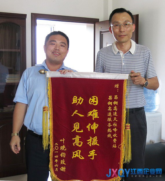 江西企業(yè)網(wǎng)訊 “真是謝謝你們,上次那500塊感謝金沒收,這旗你們可一定得收下……”21日下午16時許,在贛粵高速昌樟管理處銅鼓所天柱峰收費站,來自湖南的司機(jī)葉師傅專程把一面寫有“困難伸援手,助人見高風(fēng)”十個大字的錦旗遞到收費站值班領(lǐng)導(dǎo)手中,并向他表示感謝。
