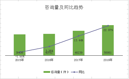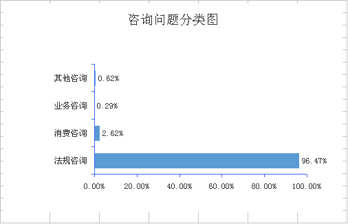 2018年,全市共受理消費(fèi)者咨詢56861件,占全年訴求總量的64.16%,同比增長22.97%。以咨詢的問題分類,涉及法規(guī)咨詢(54854件)、消費(fèi)咨詢(1490件)、業(yè)務(wù)咨詢(167件)分別占咨詢總量的96.47%、2.62%、0.29%,合計(jì)占咨詢總量的99.38%。