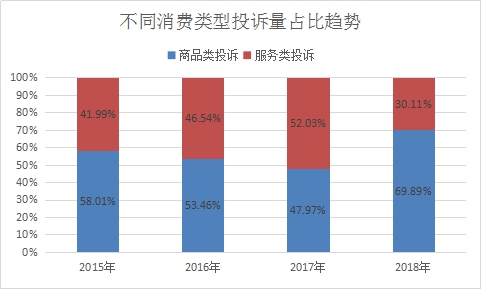 2018年,僅12315熱線共受理商品類投訴18711件,占12315熱線受理投訴總量的69.89%,同比增長70.57%;服務(wù)類投訴8061件,占12315熱線受理投訴總量的30.11%,同比下降32.25%。