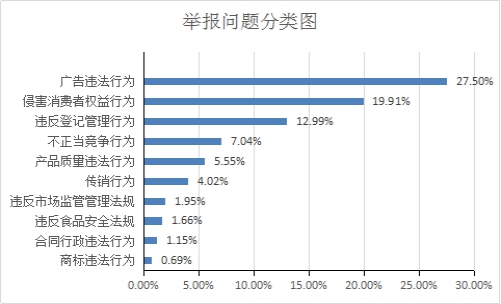 2018年,全市共受理舉報(bào)4505件,占全年訴求總量的5.09%,同比增長107.6%。從舉報(bào)反映的問題來看,涉及廣告違法行為(1239件)、侵害消費(fèi)者權(quán)益行為(897件)、違反登記管理行為(585件)的舉報(bào)量排名前三,分別占舉報(bào)總量的27.5%、19.91%、12.99%,合計(jì)占總量的60.4%。