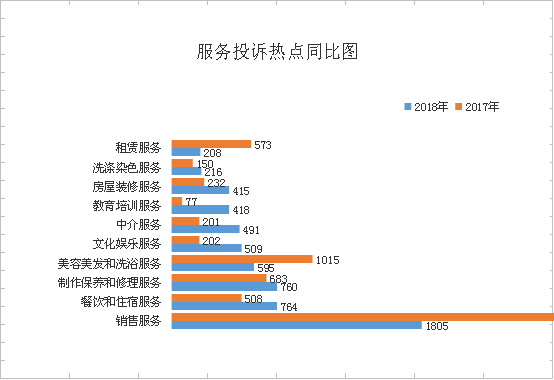 服務(wù)類投訴排在前三位的是:銷售服務(wù)(1805件)、餐飲和住宿服務(wù)(764件)、制作保養(yǎng)和修理服務(wù)(760件),分別占服務(wù)類投訴總量的22.39%、9.48%、9.43%,合計(jì)占服務(wù)類投訴總量的41.3%。