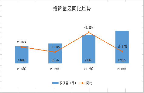 2018年,全市共受理消費(fèi)者投訴27235件,占全部訴求總量的30.73%,同比增長16.67%。