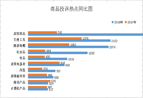 商品類投訴排在前三位的是:家居用品(3250件)、交通工具(2122件)、服裝鞋帽(2074件),分別占商品類投訴總量的17.37%、11.34%、11.08%,合計(jì)占商品類投訴總量的39.79%。從增幅來看,家居用品、化妝品、食品增幅較大,同比分別增長338.01%、244.59%、132.18%。