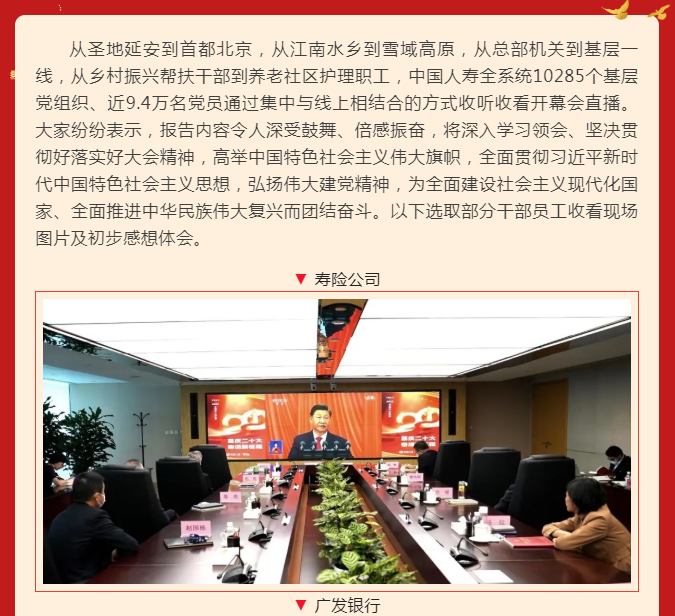 中國人壽廣大干部員工認(rèn)真收聽收看中國共產(chǎn)黨第二十次全國代表大會開幕會直播