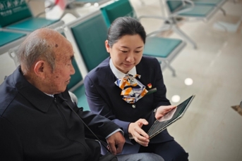 圖:客服大廳內(nèi)工作人員使用Pad為老年客戶辦理業(yè)務(wù)