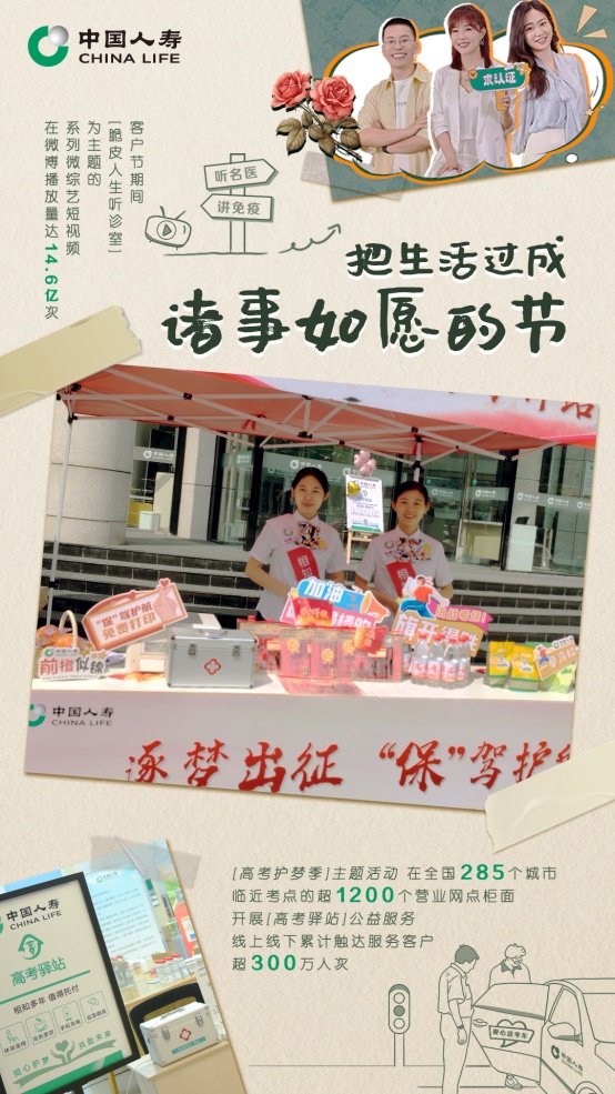 客戶節(jié)期間恰逢一年一度的高考季,十年苦讀筑夢,終要一鳴驚人。為滿足家有考生客戶的切身需求,國壽壽險與廣大考生暖心相聚,推出“高考護(hù)夢季”主題活動,聚焦“考前+考中+考后”的高考全鏈路,在全國285個城市臨近考點的超1200個營業(yè)網(wǎng)點柜面開展“高考驛站”公益服務(wù),為考生及家長保駕護(hù)航。圍繞“名師指導(dǎo)show未來”,以“線上直播答疑+線下講座咨詢”為主線,打造高考志愿填報科普“志”囊團(tuán)。在江蘇、湖南、湖北、河南、陜西、內(nèi)蒙古、廣西、北京開展“閃光8城”線下志愿填報巡講活動,同步在北京、南京小范圍探索開展“985直通車”一日游學(xué)活動。線上線下累計觸達(dá)服務(wù)客戶超300萬人次。將優(yōu)勢資源與服務(wù)送至客戶身邊,暖心守護(hù)考生夢想之路。