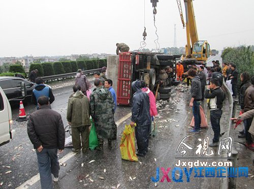 11日凌晨,滬昆高速一輛浙江牌照運(yùn)魚車側(cè)翻,大量活魚灑落一地