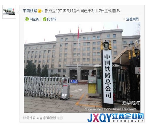 江西企業(yè)網(wǎng)3月18日北京訊據(jù)原鐵道部新華網(wǎng)官方微博“中國鐵路”消息:“新成立的中國鐵路總公司已于3月17日正式掛牌。”。