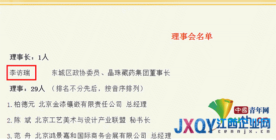 #p#副標(biāo)題#e#點(diǎn)擊右下側(cè)的永定文化交流促進(jìn)會(huì),便進(jìn)入北京市東城區(qū)永定文化交流促進(jìn)會(huì)的官方網(wǎng)站,其中在"促進(jìn)會(huì)簡(jiǎn)介"中有這樣的文字:"北京市東城區(qū)永定文化交流促進(jìn)會(huì)是在北京市東城區(qū)文化委員會(huì)領(lǐng)導(dǎo)下并在北京市東城區(qū)民政局登記注冊(cè)的社團(tuán)組織。""北京市東城區(qū)永定文化交流促進(jìn)會(huì)最高決策機(jī)構(gòu)為理事會(huì)。理事會(huì)由理事會(huì)、顧問(wèn)委員會(huì)組成,并設(shè)有監(jiān)事會(huì)。理事會(huì)設(shè)有名譽(yù)理事、理事長(zhǎng)、副理事長(zhǎng)和理事。""北京東城區(qū)永定文化交流促進(jìn)會(huì)已建設(shè)了永定書(shū)院、永定會(huì)所、永定國(guó)禮展廳、永定小劇場(chǎng)等文化活動(dòng)和設(shè)施。"在北京市東城區(qū)永定文化交流促進(jìn)會(huì)官網(wǎng)上的"組織架構(gòu)"欄目中,赫然寫(xiě)著理事長(zhǎng)為東城區(qū)政協(xié)委員、晶珠藏藥集團(tuán)董事長(zhǎng)李訪瑞。