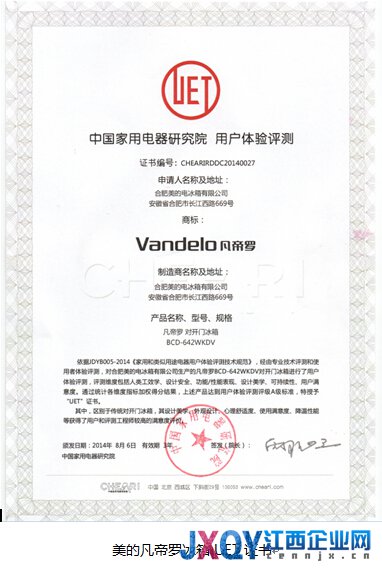 江西企業(yè)網(wǎng)訊 通訊員 柯可 報(bào)道 日前,由中國家用電器研究院主辦的2014年冰箱行業(yè)用戶體驗(yàn)指數(shù)發(fā)布暨冰箱產(chǎn)品用戶體驗(yàn)評(píng)測(cè)發(fā)布會(huì)在京召開,美的、西門子等國內(nèi)外知名冰箱品牌企業(yè)參與測(cè)評(píng)。此次測(cè)評(píng)中,共有11家冰箱制造企業(yè)的15款產(chǎn)品通過產(chǎn)品并獲得“UET”證書。其中,美的凡帝羅642WKDV對(duì)開門冰箱通過此次“用戶體驗(yàn)測(cè)評(píng)”并獲得“UET”證書。