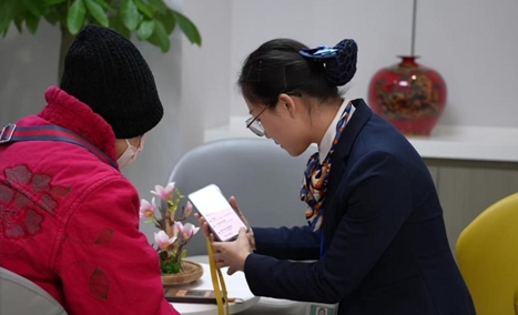 中國人壽壽險公司柜面工作人員幫老年客戶辦理業(yè)務