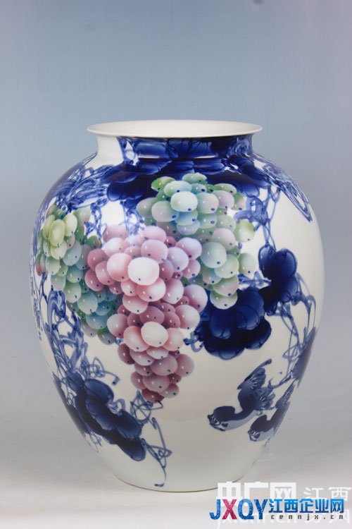 吳志輝的光影青花有國(guó)畫的構(gòu)圖筆墨和神韻,一點(diǎn)一畫一筋一葉,寫意中透露的是他的水墨修養(yǎng)。同時(shí),運(yùn)用了西畫黑白灰的對(duì)比,使得造型虛實(shí)相生、立體鮮活,通過精心布局和青花噴花的深淺濃淡變化,他描繪出的景物呈現(xiàn)著強(qiáng)烈的空間感,光影生動(dòng)、形態(tài)逼真。尤其是他筆下的葡萄,重重疊疊間晶瑩剔透,水潤(rùn)誘人。