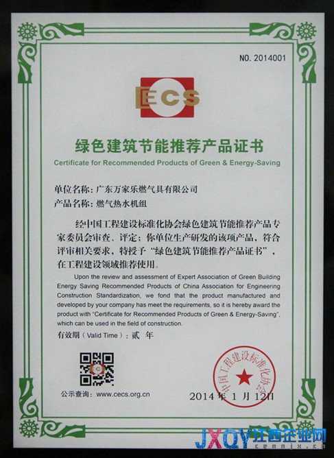 萬(wàn)家樂(lè)獲“綠色建筑節(jié)能推薦產(chǎn)品證書(shū)”