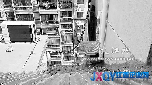 由于王女士家住頂樓,記者隨后來到該棟樓的頂部。記者觀察到,開發(fā)商沒有將落水管接到地上,而是將水直接排放到屋頂瓦片,再順著墻面流向地面。而隨著時間的日積月累,落水管出水口已經(jīng)形成了一個不小的“淺水灣”。一旦雨水來時,不可避免地滲入墻體。