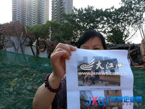 裘女士在廢墟前展示房屋被偷拆前的照片。本報(bào)記者劉濟(jì)海攝
