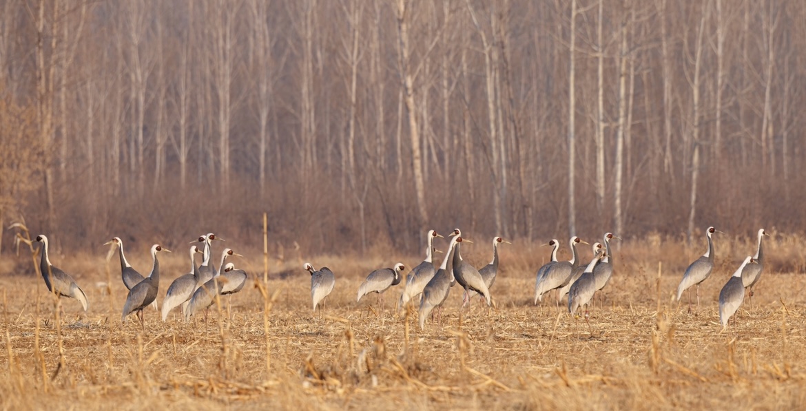 圖:國家一級保護動物白枕鶴正在北京密云近自然森林經營及鳥類棲息地優(yōu)化項目地停歇覓食