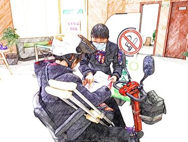 “您好!請(qǐng)問(wèn)您需要辦理什么業(yè)務(wù)?”王劍習(xí)慣性回應(yīng)道。只見那個(gè)阿姨坐在輪椅上,身體縮成了一團(tuán),孤零零一人在門口。見狀,王劍和同事呂霞馬上默契地快速走出門去迎接。