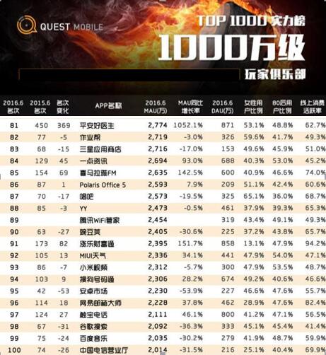 同時,國內(nèi)知名的移動大數(shù)據(jù)服務(wù)提供商QuestMobile發(fā)布的最新《2016年中APP實力榜》顯示,截至2016年6月,平安好醫(yī)生月活躍用戶(MAU)已達(dá)到2774萬,同比增長率為1052%,線上消費活躍率達(dá)到62%。平安好醫(yī)生已擠身MAU千萬級俱樂部。(數(shù)據(jù)來源:QuestMobile年中MAU TOP1000榜單)