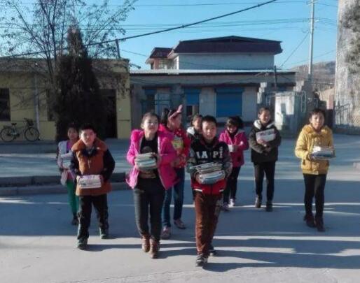 山西省汾陽(yáng)市栗家中心校桑棗坡小學(xué)的學(xué)生,迎接新到的一批圖書(shū)