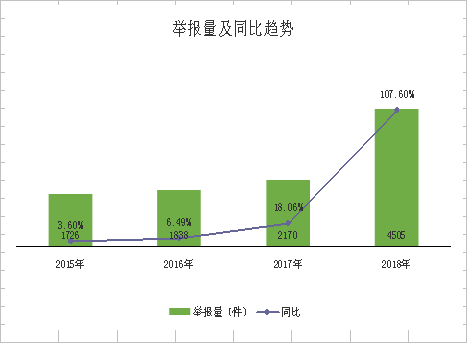 2018年,全市共受理舉報(bào)4505件,占全年訴求總量的5.09%,同比增長107.6%。從舉報(bào)反映的問題來看,涉及廣告違法行為(1239件)、侵害消費(fèi)者權(quán)益行為(897件)、違反登記管理行為(585件)的舉報(bào)量排名前三,分別占舉報(bào)總量的27.5%、19.91%、12.99%,合計(jì)占總量的60.4%。