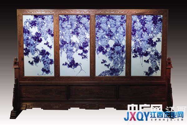 吳志輝的光影青花有國(guó)畫的構(gòu)圖筆墨和神韻,一點(diǎn)一畫一筋一葉,寫意中透露的是他的水墨修養(yǎng)。同時(shí),運(yùn)用了西畫黑白灰的對(duì)比,使得造型虛實(shí)相生、立體鮮活,通過精心布局和青花噴花的深淺濃淡變化,他描繪出的景物呈現(xiàn)著強(qiáng)烈的空間感,光影生動(dòng)、形態(tài)逼真。尤其是他筆下的葡萄,重重疊疊間晶瑩剔透,水潤(rùn)誘人。