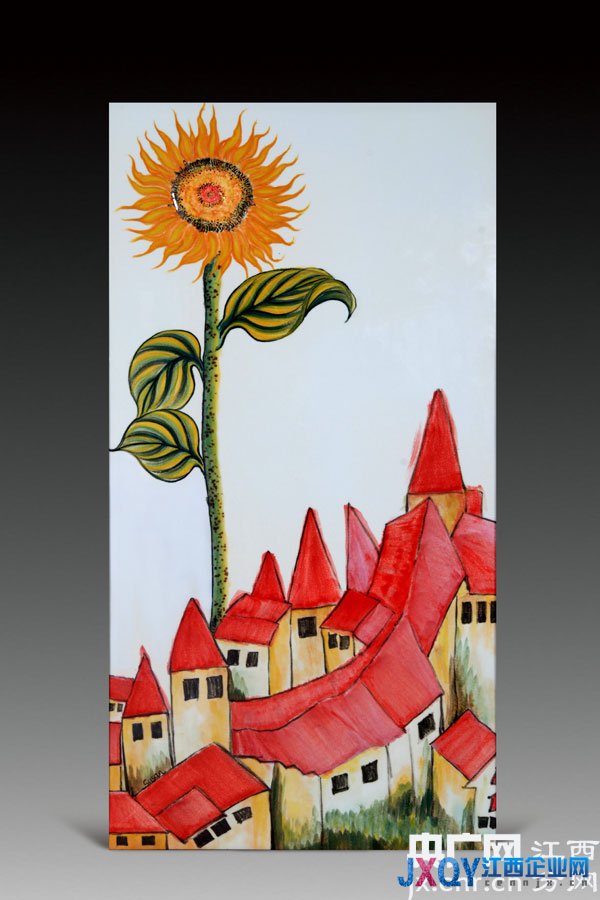 在她的向日葵系列瓷板畫作品中,有一幅被蘇姍列為“非賣品”的,是作者比較滿意的作品之一,畫面上呈現(xiàn)的是一排別致的鄉(xiāng)間小屋與極其高大的向日葵——它們的個頭甚至高過了小屋。這并非是荒誕的超現(xiàn)實主義繪畫,而是取材于真實事件,英國一戶人家培育出了高達8米的向日葵,其高度確實超越了自家的小別墅。蘇姍認為這件事充分體現(xiàn)出向日葵的生命本質(zhì),那就是對光明的向往與追逐,那是一股令人欽佩的向陽的力量。