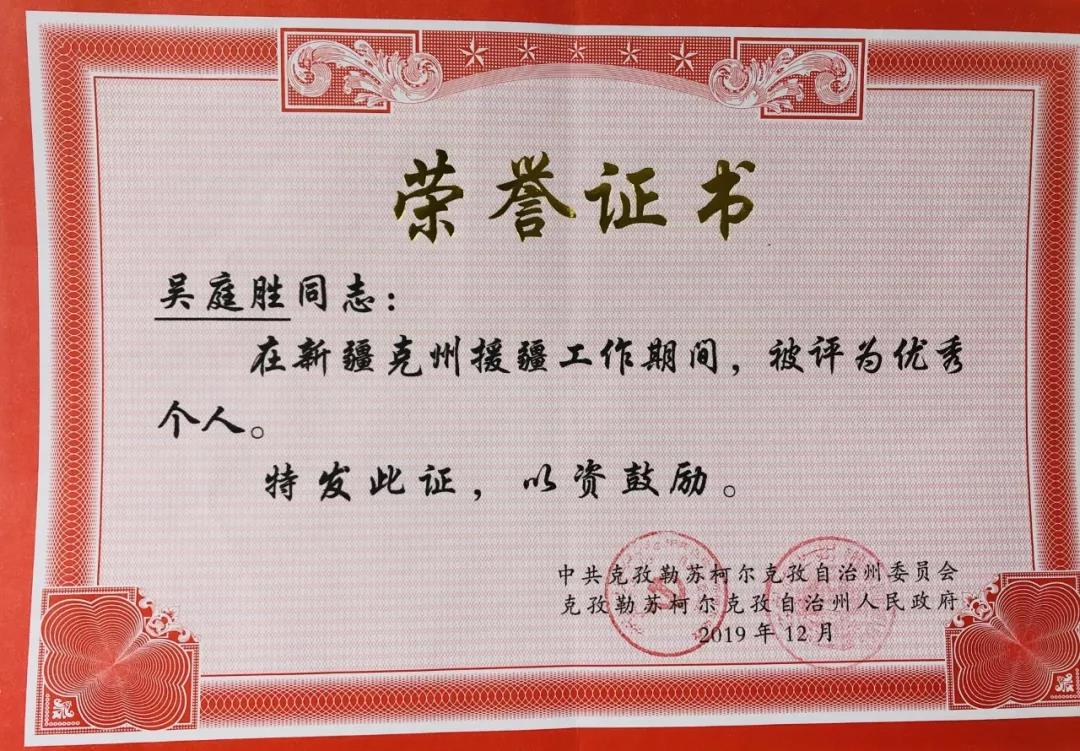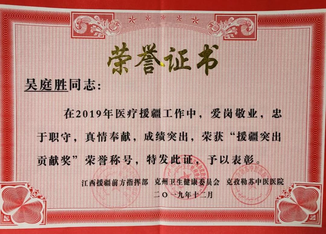 由于工作成績(jī)突出,吳庭勝先后榮獲克州黨委和政府聯(lián)合頒發(fā)的“援疆優(yōu)秀個(gè)人”、江西援疆前方指揮部和克州衛(wèi)健委聯(lián)合授予的“援疆突出貢獻(xiàn)獎(jiǎng)”等榮譽(yù)稱號(hào)。