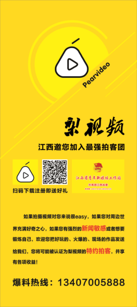 據(jù)了解,梨視頻江西專注老百姓身邊的故事,對(duì)人物類,故事類,奇聞趣事類的視頻或有監(jiān)控錄像的事件都大量需求。另?yè)?jù)了解,今年4月份,共青團(tuán)江西省委授予梨視頻江西-江西省青年新媒體工作站。如果你也熱愛(ài)拍攝視頻,歡迎聯(lián)系投稿,一經(jīng)采用,稿費(fèi)從優(yōu)。 聯(lián)系電話:13407005888 曾偉