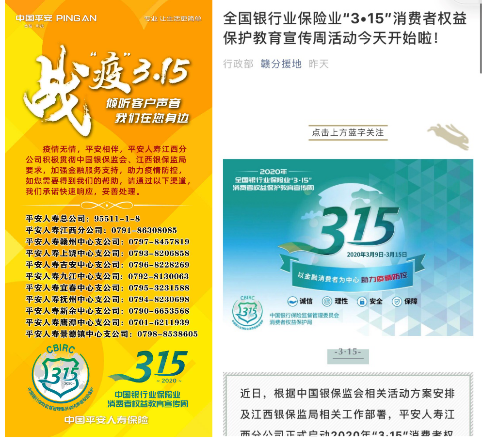 江西企業(yè)網(wǎng)訊 近日,根據(jù)中國銀保監(jiān)會相關(guān)活動方案安排及江西銀保監(jiān)局相關(guān)工作部署,2020年“3.15”消費(fèi)者權(quán)益保護(hù)教育宣傳周活動已正式啟動。平安人壽江西分公司積極響應(yīng)號召,結(jié)合當(dāng)前特殊疫情形式通過多種線上渠道開展“以消費(fèi)者為中心助力疫情防控”為主題的宣傳教育活動,以提升保險消費(fèi)者金融素養(yǎng)為己任,在提高消費(fèi)者風(fēng)險防范意識和自我保護(hù)能力的同時,持續(xù)推動保險行業(yè)消費(fèi)者權(quán)益保護(hù)工作,做好新冠肺炎防疫期間的保險服務(wù)工作。
