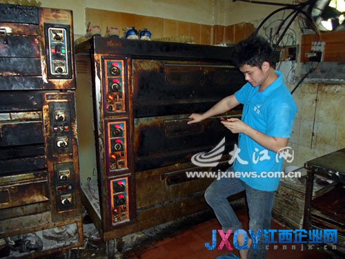 19日下午,記者在鳳凰花園東區(qū)的一排店面內(nèi)找到了該廠,該廠大門緊閉,但陣陣糕點(diǎn)香味正通過排氣扇傳出。記者從店面外面的窗戶窟窿往里面望去,一名年輕小伙子正打著赤膊在烘烤房內(nèi)忙活著。