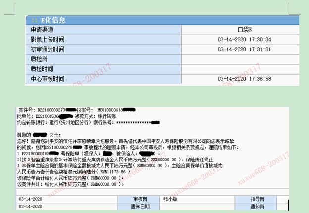2020年3月10日, A先生因愛人被確診甲狀腺癌后撥打95511報(bào)案,平安人壽吉安中支理賠人員在收到報(bào)案信息后,立即聯(lián)系客戶了解病情,經(jīng)過核實(shí)后,把相關(guān)材料寄給客戶簽字。2020年3月14日,客戶通過微信把相關(guān)病歷及材料拍給理賠人員。當(dāng)天下午5點(diǎn)30分完成理賠材料上傳,該案件結(jié)案僅僅花費(fèi)6分鐘,賠付金額6萬元。